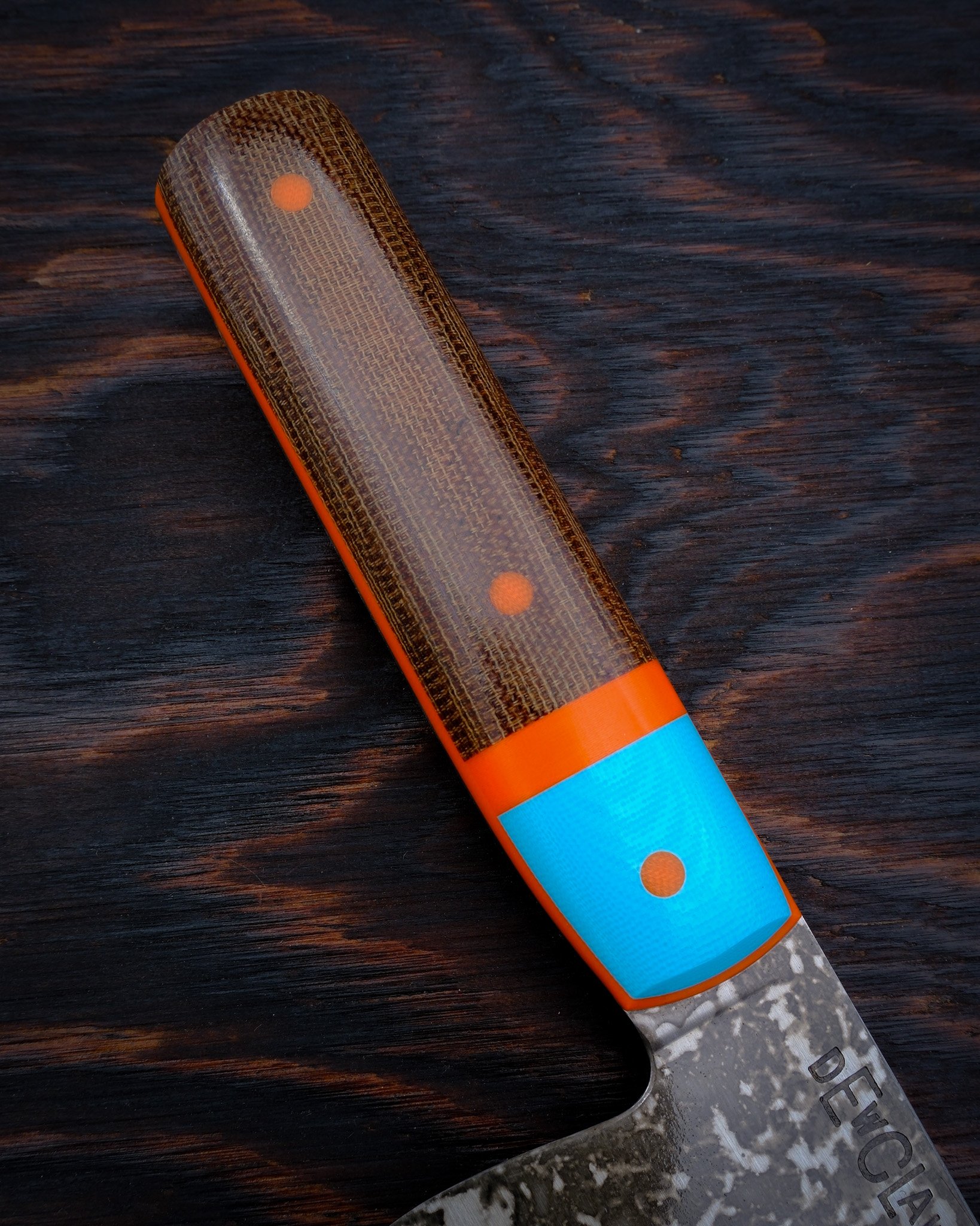 Handle: Nat. Canvas Micarta, Turquoise and Orange G10