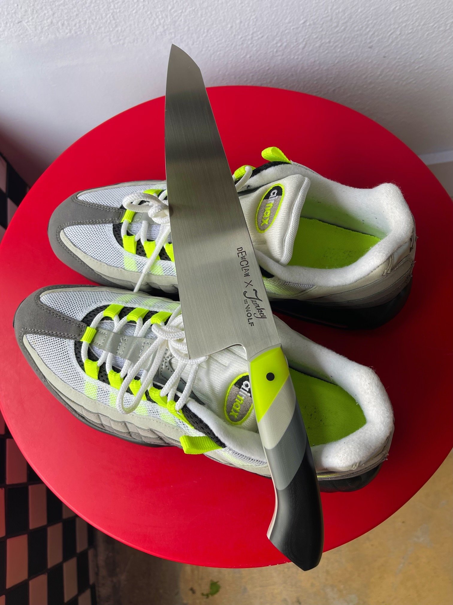 “INTRODUCING THE DEWCLAW KNIVES X TURKEY AND THE WOLF SNEAKERHEAD CHEF’S KNIFE, AN ALL PURPOSE GYOTO AVAILABLE IN AIR MAX 95 OG NEON AND JORDAN 1 OG CHICAGO COLORWAYS, DESIGNED FOR THE RENAISSANCE FOOTWEAR AFICIONADO AND HYPEBEAST CHEF ALIKE. HANDMADE FROM START TO FINISH RIGHT HERE IN NEW ORLEANS.”